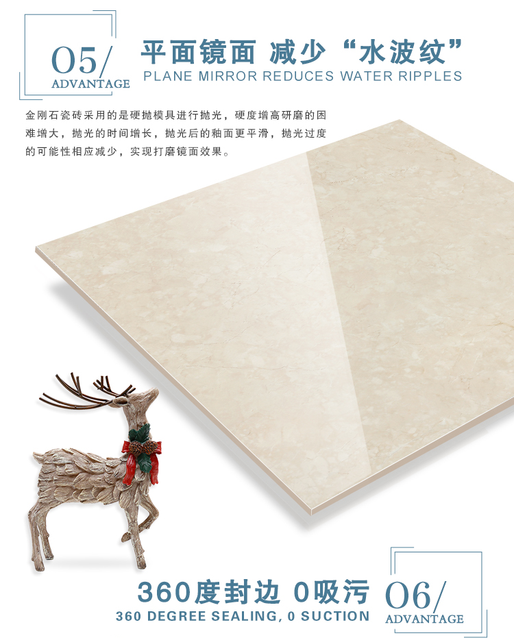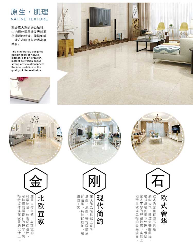 金曼古瓷磚廠家特價金剛石因高品質而得名,是一款極具天然石材效果和微晶石質感的仿石材瓷磚,它不但在價格、環保、耐用和清潔上極具優勢,在質感、規格、花色、重量等指標上,金剛石都遠遠勝于石材、拋光磚。相比其他種類的產品,它最大的特點可以用“高亮度、高耐磨、高平整、高逼真、高清晰、高環保”。