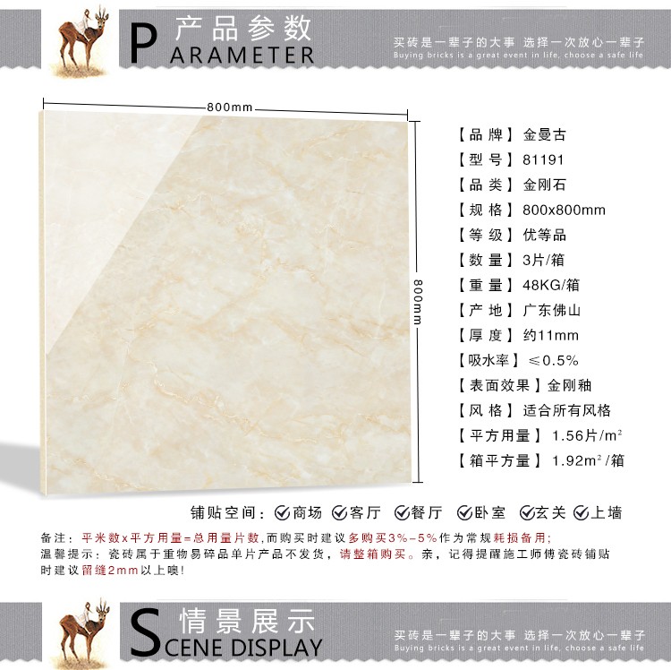 金曼古全拋釉瓷磚運用多層特殊制造工藝,將全透析釉料下彩技術(shù)結(jié)合先進印刷工藝,令花紋俯在下層,低碳能源、清潔生產(chǎn),表面光潔剔透,獨有釉料精拋工序,集拋光磚與仿古磚優(yōu)點于一體,釉面如拋光磚般光滑亮潔,同時其釉面花色如仿古磚般圖案豐富,色彩厚重或絢麗。