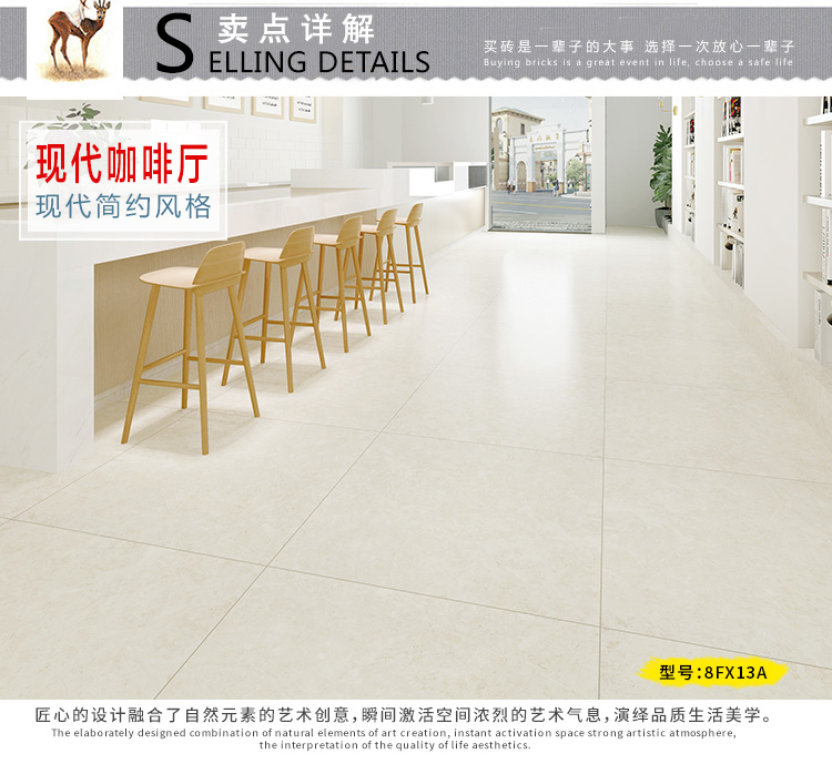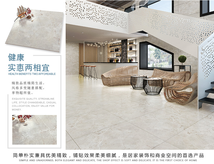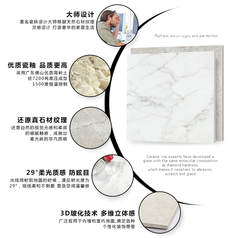 柔光瓷磚是磚面反射介于強(qiáng)光與弱光之間的一類瓷磚,其結(jié)合亮光類瓷磚的高調(diào)明艷裝飾和啞光類瓷磚的低調(diào)內(nèi)斂搭配效果,通過動態(tài)柔光蠟拋技術(shù),降低產(chǎn)品反光率,從而達(dá)到人體舒適的視覺感受以及無光污染的空間裝飾效果。優(yōu)點(diǎn):1.視覺舒適,無光污染 2.堅(jiān)固耐磨,不易刮花.