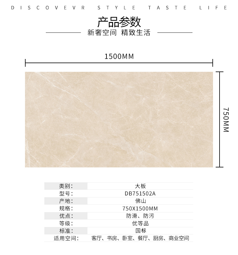 大規格瓷磚(DB751502A)-工程瓷磚 金曼古大規格瓷磚引進世界最先進的超大型壓機自動壓制而成,具有超大規格,超高硬度,超高致密度,超長時間煅燒,超低吸水率,超高光澤度。其磚面紋理流暢自然,效果逼真,適用于大型工程外墻干掛和酒店、商場、各辦公樓大堂等地面裝修