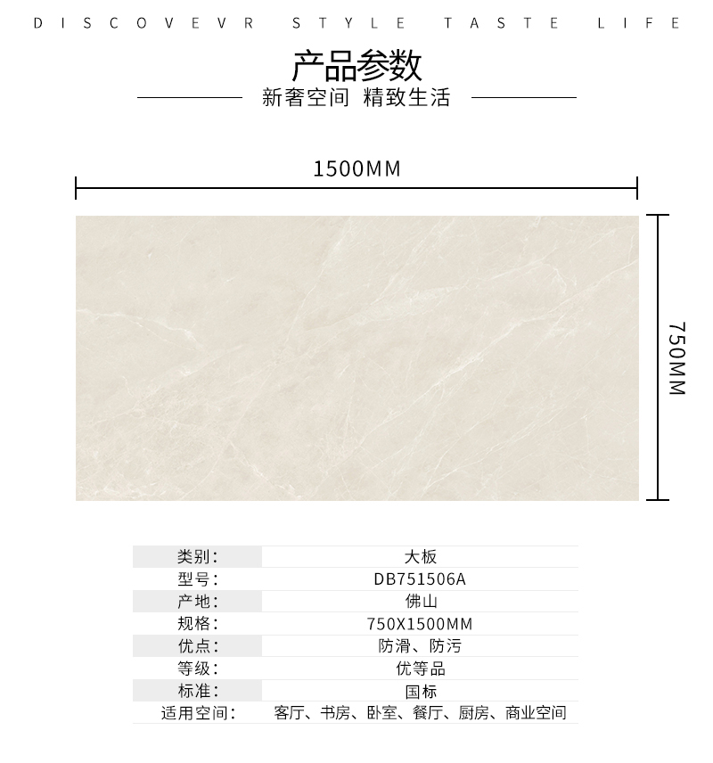大規格瓷磚(DB751506A)-工程瓷磚 金曼古大規格瓷磚引進世界最先進的超大型壓機自動壓制而成,具有超大規格,超高硬度,超高致密度,超長時間煅燒,超低吸水率,超高光澤度。其磚面紋理流暢自然,效果逼真,適用于大型工程外墻干掛和酒店、商場、各辦公樓大堂等地面裝修