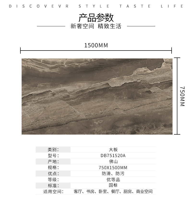 大規(guī)格瓷磚(DB751520A)-工程瓷磚 金曼古大規(guī)格瓷磚引進世界最先進的超大型壓機自動壓制而成,具有超大規(guī)格,超高硬度,超高致密度,超長時間煅燒,超低吸水率,超高光澤度。其磚面紋理流暢自然,效果逼真,適用于大型工程外墻干掛和酒店、商場、各辦公樓大堂等地面裝修